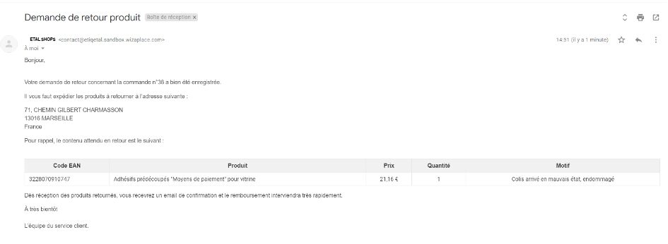 Vous recevrez une notification vous indiquant que votre demande de retour a bien été envoyée avec les références du produit sur lequel porte la réclamation. Dans l'email, vous retrouverez les coordonnées du marchand pour envoyer son colis.