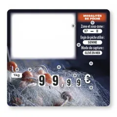 Nuestras etiquetas de precios para pescaderías están fabricadas en PVC duradero especialmente diseñado para soportar las condiciones de humedad de su puesto. Para una legibilidad óptima, le recomendamos nuestro formato estándar de 10 x 10 cm, que le permite incluir toda la información obligatoria sin dejar de ser perfectamente visible para sus clientes.